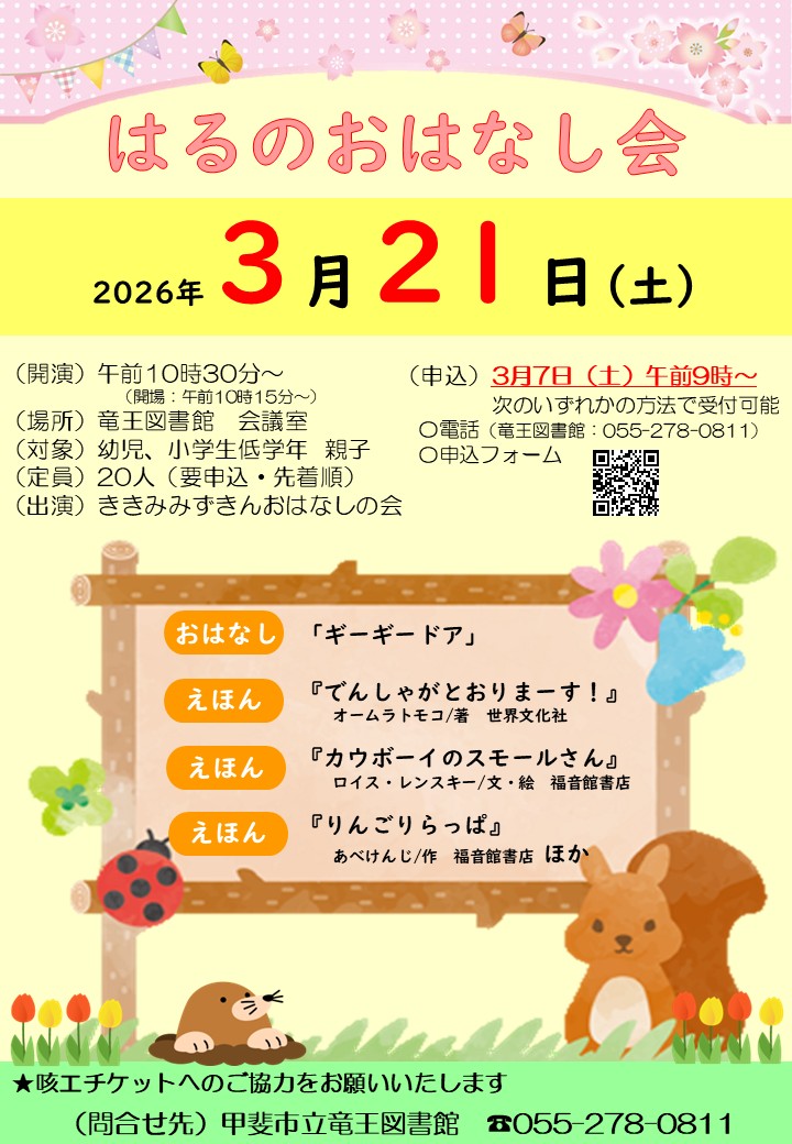 3月7日(土)午前9時から竜王図書館にて電話受付 竜王図書館 TEL:055-278-0811 |