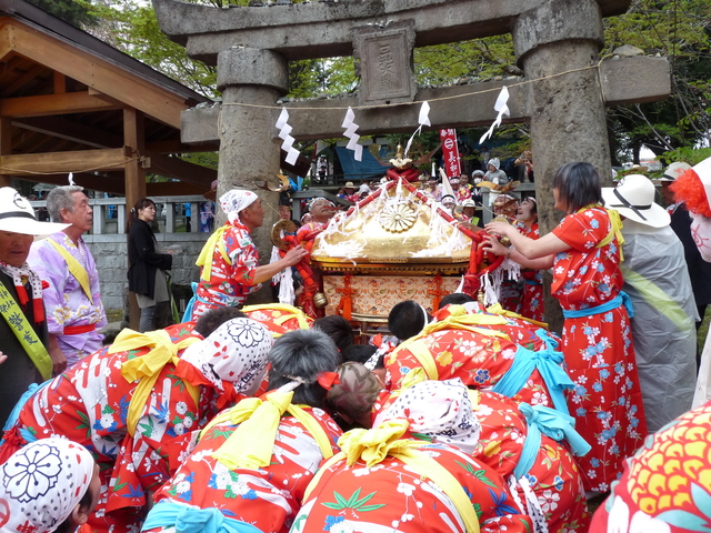 神輿の担ぎ手は、女性の恰好をして「ソコダイ・ソコダイ」と掛け声をかけながら渡御していきますが、女性の格好をするようになった時期は定かではありませんが浅間神社の祭神が女性神であったことから赤い長襦袢を着、花笠に白粉をするようになったようです。また、長い距離を練り歩いてくるため、「目的地はすぐそこだ」という意味で担ぎ手が景気をつけるために「ソコダイ」というようになったといわれています。