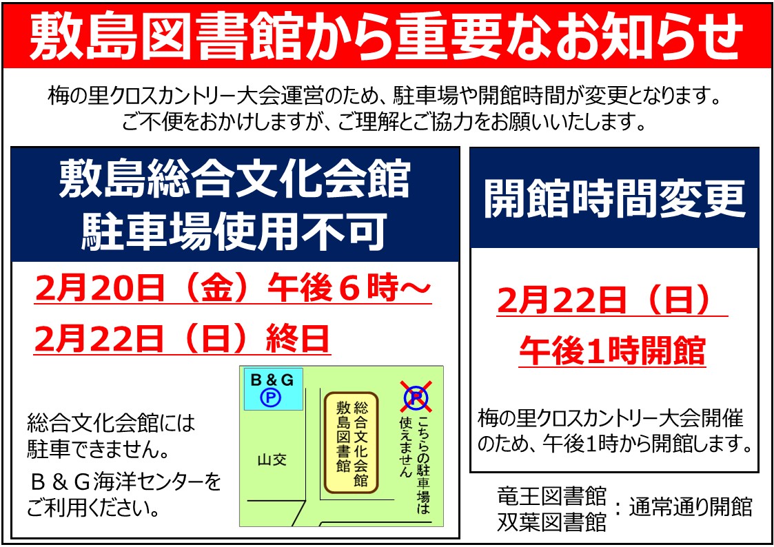 「甲斐梅の里クロスカントリー大会」の開催に伴い、敷島図書館の開館時間、駐車場について次のとおり変更となります。